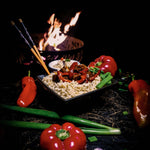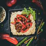 Super succulent beef chunks are coated in our in-house sticky, sweet and spicy sauce. Served with brown rice, spinach and shredded carrot and sauteed capscium.