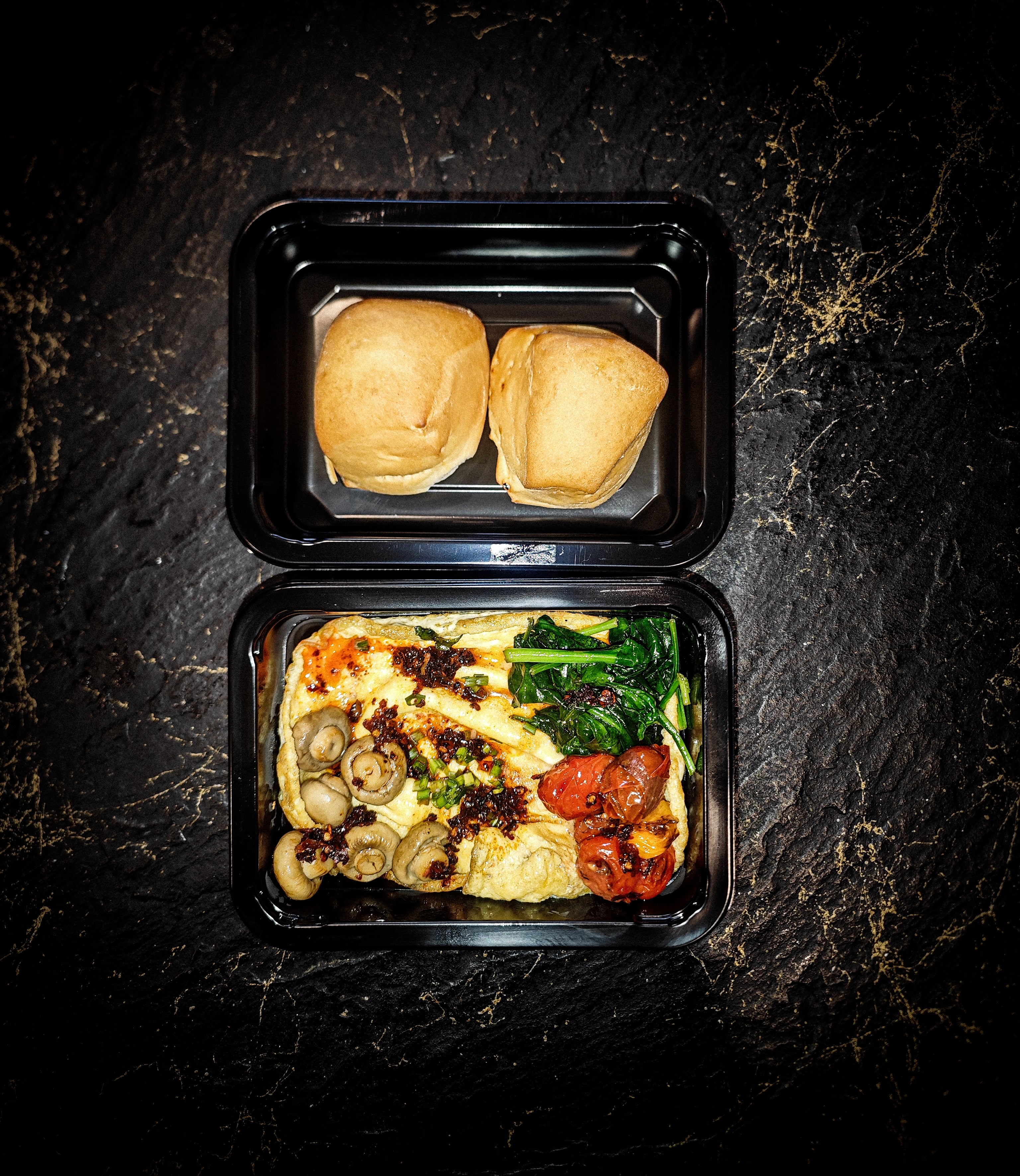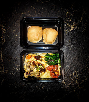 Our perfectly made scrambled eggs with toped with saluted cherry tomatoes, mushrooms and spinach. Coupled a side of two mini loafs.