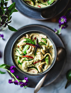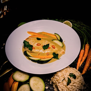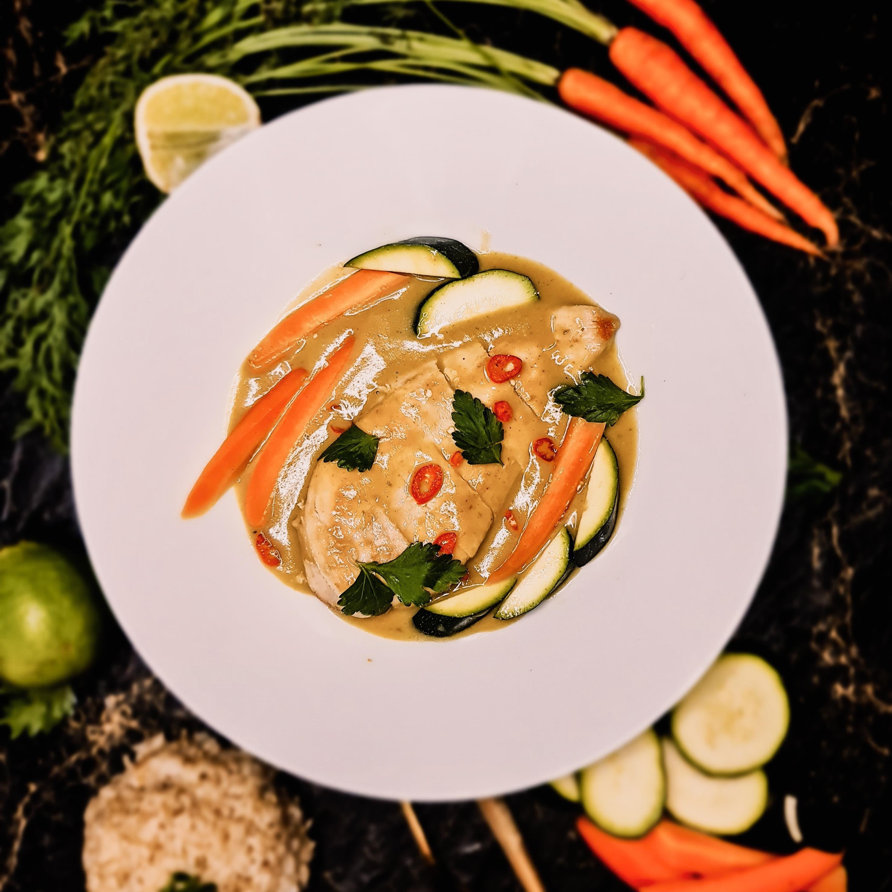 | Ingredients | Chicken (40%), Green curry sauce (10%) coconut cream (4%), chilli flakes (1%), Rice (30%), carrot (7.5%), Green beans (7.5%) | |