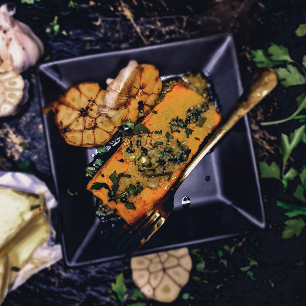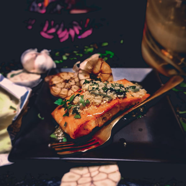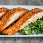Baked salmon portion for some extra protein in your life. Seasoned in our garlic butter sauce.